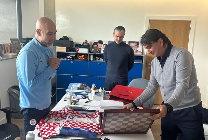 Dan kasnije, hrvatsku delegaciju u svom je uredu u trening centru Manchester Cityja ugostio trener Cityja Pep Guardiola, s kojim su izbornik Dalić i suradnici razgovarali o statusu hrvatskih reprezentativaca i njihovom stanju nakon težih ozljeda. Mateo Kovačić nedavno se vratio na teren nakon dužeg izbivanja, dok je Joško Gvardiol u fazi oporavka koji teče predviđenim programom.